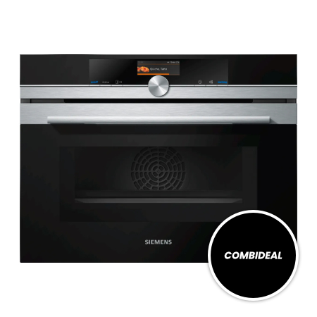 Verkocht als set van 2. Siemens CM636GBS1 oven met magnetron en CF634AGS1 inbouwmagnetron. Samen voor €1300,-. De Siemens cm636gbs1 is een compacte oven met magnetron welke met minder kooktijd hetzelfde resultaat bereikt. De varioSpeed functie combineert verwarm en magnetronfuncties op intelligent wijze om de kooktijd tot wel 50% te verkorten. Met coolStart bereik je de ingestelde temperatuur nog sneller en is voorverwarmen niet meer nodig. Je hoeft minder schoon te maken dankzij de speciale coating van de achterwand. De ecoClean-coating zorgt ervoor dat vuil afbreekt en de geur enorm afneemt. cookControl Plus bewaakt de voortgang van je gerecht en past de oveninstellingen daarop aan. De Siemens cm636gbs1 zorgt voor de juiste verwarmstand, temperatuur en baktijd. Er zit zelfs een speciale pizzastand op die zorgt dat pizzabodems heerlijk knapperig worden. Ook is dit model voorzien van functies als grill, hetelucht, magnetron en boven- en onderwarmte. Het gebruiksvriendelijke TFT-Touchdisplay zorgt tevens voor een optimale weergave en menu navigatie.